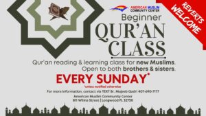 SUNDAY – Qur’an Beginner Class for Reverts to learn how to read Qur’an. Open to both brother & sisters.